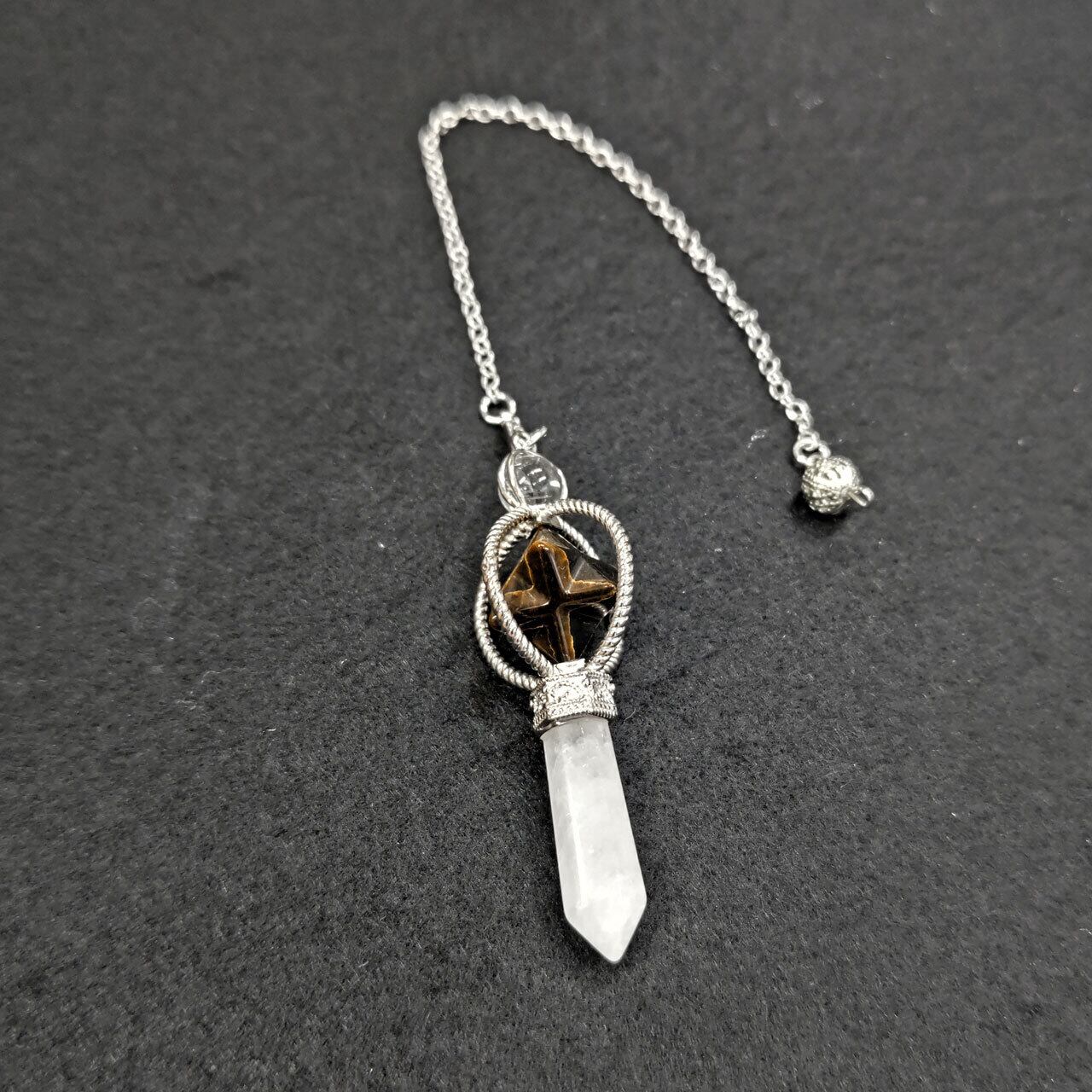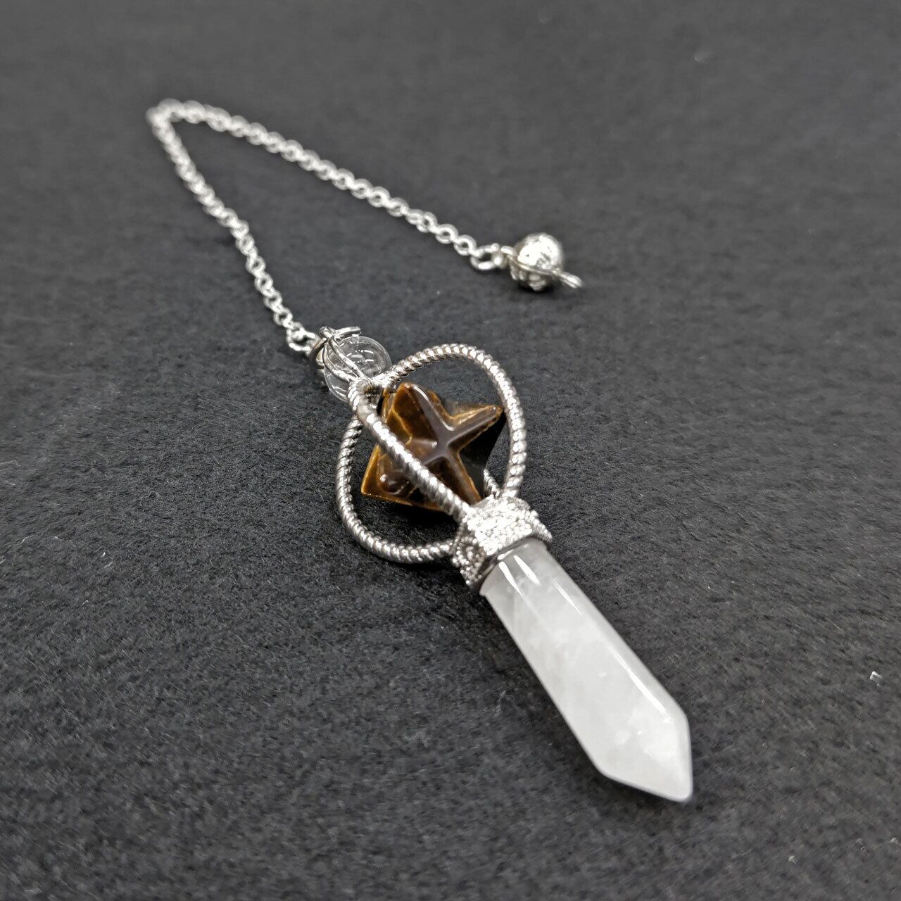 マカバスターの形にカットしたタイガーアイと六角柱の水晶を使用した天然石ペンデュラム。