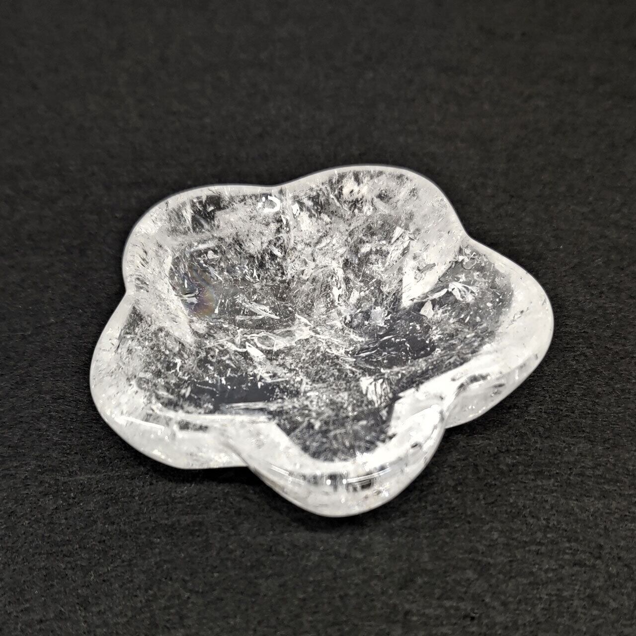 この花型プレートは、透明度の高い水晶を使用しており、その美しい輝きがインテリアを豊かに彩ります。水晶は、浄化や癒しのエネルギーをもたらすと信じられており、持つ人にポジティブな影響を与えると言われています。ナチュラルな形状の花型は、見る者に安らぎや癒しを与える特別な存在感を持っています。